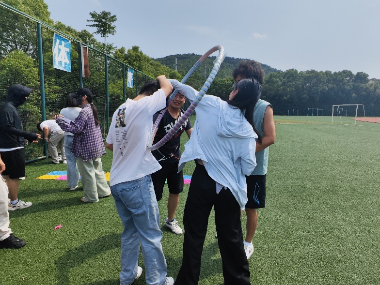 能量传递圈:指尖不触,默契无间。四人手拉手组成闭环,通过身体扭动将呼啦圈从头到脚传递至队友,全程禁止用手触碰。违规一次则要重新开始,用时最短者胜。选手们或弓腰或跳跃,有人如灵蛇般扭动腰肢让呼啦圈贴身“滑行”,有人弓背如满月,将呼啦圈“弹射”至队友手中,每一次成功的传递都伴随着欢声笑语,现场洋溢着青春的活力与团队的温暖。