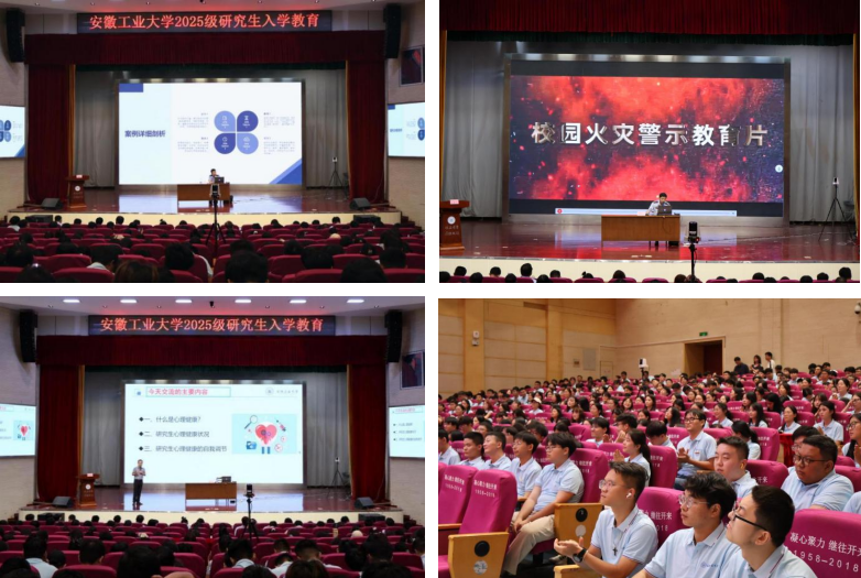 马鞍山市公安局刑侦支队二大队胡进警官聚焦“预防电信网络诈骗”主题,结合实际案例,向全体研究生新生系统地讲解了当前高发的网络诈骗形式与手段,帮助新生精准识别骗局,提升风险辨别能力与自我防护意识;马鞍山市消防救援支队王明明科长以典型火灾案例为切入点,系统阐释了消防安全的重要性,通过播放标准化教学视频,现场讲解了灭火器的使用方法以及消火栓的水带铺设、接口连接等关键技术要领,并给同学们普及了必备的消防安全常识;学生工作部(处)副部(处)长、大学生心理健康教育咨询中心主任俞超老师围绕研究生心理健康主题,系统分析了学业压力、科研压力、人际关系等典型心理困扰的成因与表现,并向同学们普及基本的心理健康知识,引导同学们正确认识自我心理状态,掌握科学的压力应对策略,学会自我关怀、主动求助,积极利用校内外心理资源,建立健康稳定的学习生活状态。