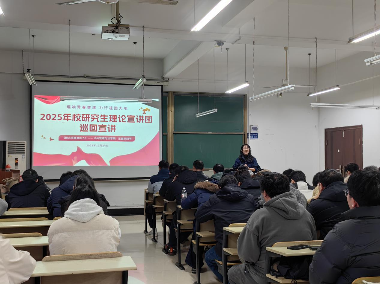 为加强我校研究生思想政治教育,引导青年学生深入学习宣传贯彻党的创新理论,深刻领悟其精神实质与丰富内涵,推动党的创新理论学习常态化、长效化开展,12月22日至1月13日期间,研究生院(研究生工作部)组织研究生理论宣讲团走进十五个研究生培养单位,开展了一系列主题鲜明、内容丰富的理论宣讲活动,在广大师生中引起热烈反响。