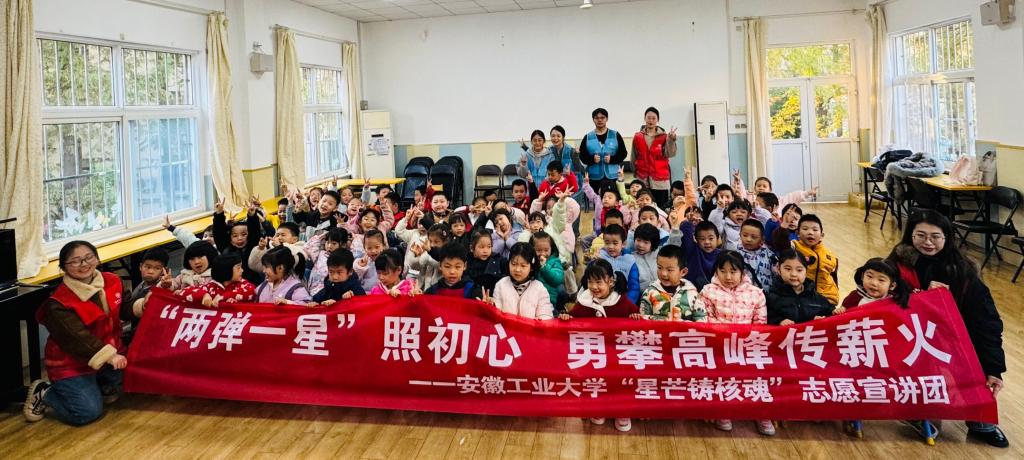 最后,志愿者播放《中国“两弹一星”成长记》视频短片,展示原子弹、导弹、人造卫星等重大科技成果的诞生时间,以及它们对中国的意义。活动现场不时响起孩子们阵阵稚嫩的掌声和惊叹声,他们眼中闪烁着敬佩与向往的光芒。互动提问环节中,孩子们的回答既充满童真,又流露出坚定的情感。宣讲员王晨乐感叹道:“看到孩子们眼里闪烁的光芒,我们觉得所有准备都值得,希望‘两弹一星’精神能在他们心中深深扎根。”