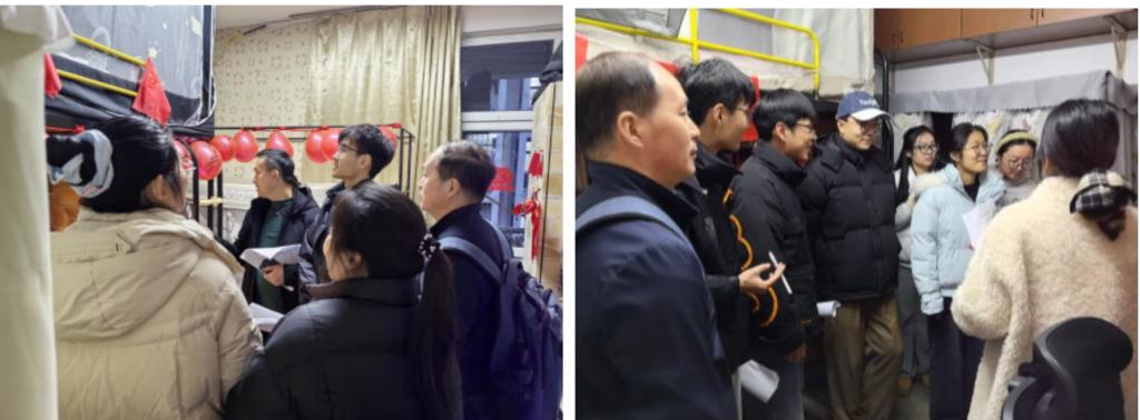 评审阶段,由学院领导、班主任、辅导员以及研究生会主席团和相关部门组成的师生评委团深入各研究生公寓宿舍开展现场评审工作,围绕“寝室公共安全卫生”“寝室环境”“红色文化”三个核心维度进行量化打分。评委们细致核查每一项指标,并详细记录各宿舍特色亮点。评审过程中,各宿舍同学们积极分享创建理念,评委们耐心点评指导,现场氛围热烈融洽,深化了师生情谊。