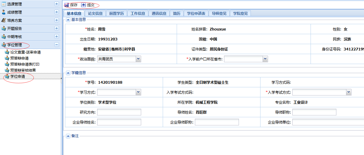注意事项:点击学位管理下的学位申请菜单,填写完毕后