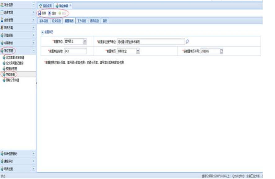 注意事项:点击学位管理下的学位申请菜单,填写完毕后点击保存并提交。论文关键词要求3--5个,每个关键词之间用中文逗号隔开。每个标签里的内容都必须填,否则将导致信息不全。