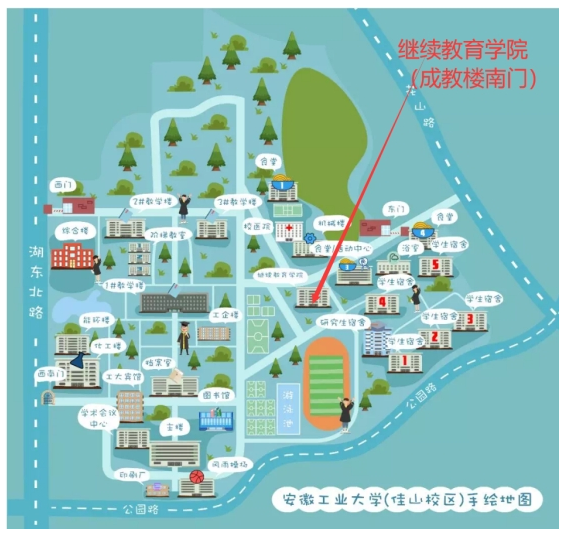 高铁东站乘坐6路公交在安徽工业大学(湖东路)站下,从佳山校区西北门或西南门进大约800米左右到成教楼;或打的至佳山校区东门下(花山路上),从东门进大约150米到成教楼 |